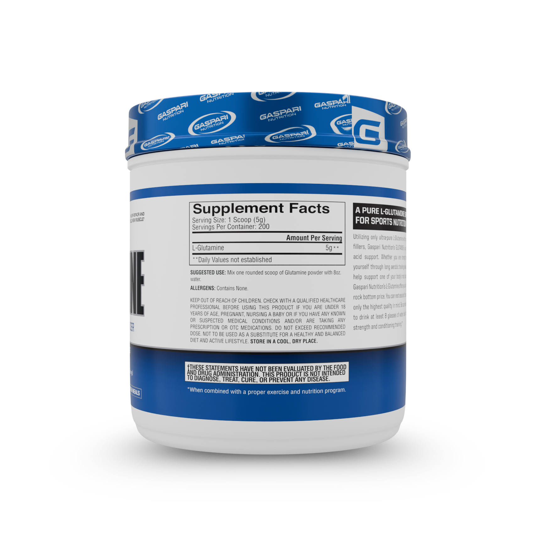 Suggested Use: Mix one rounded scoop of Glutamine powder with 8oz water.