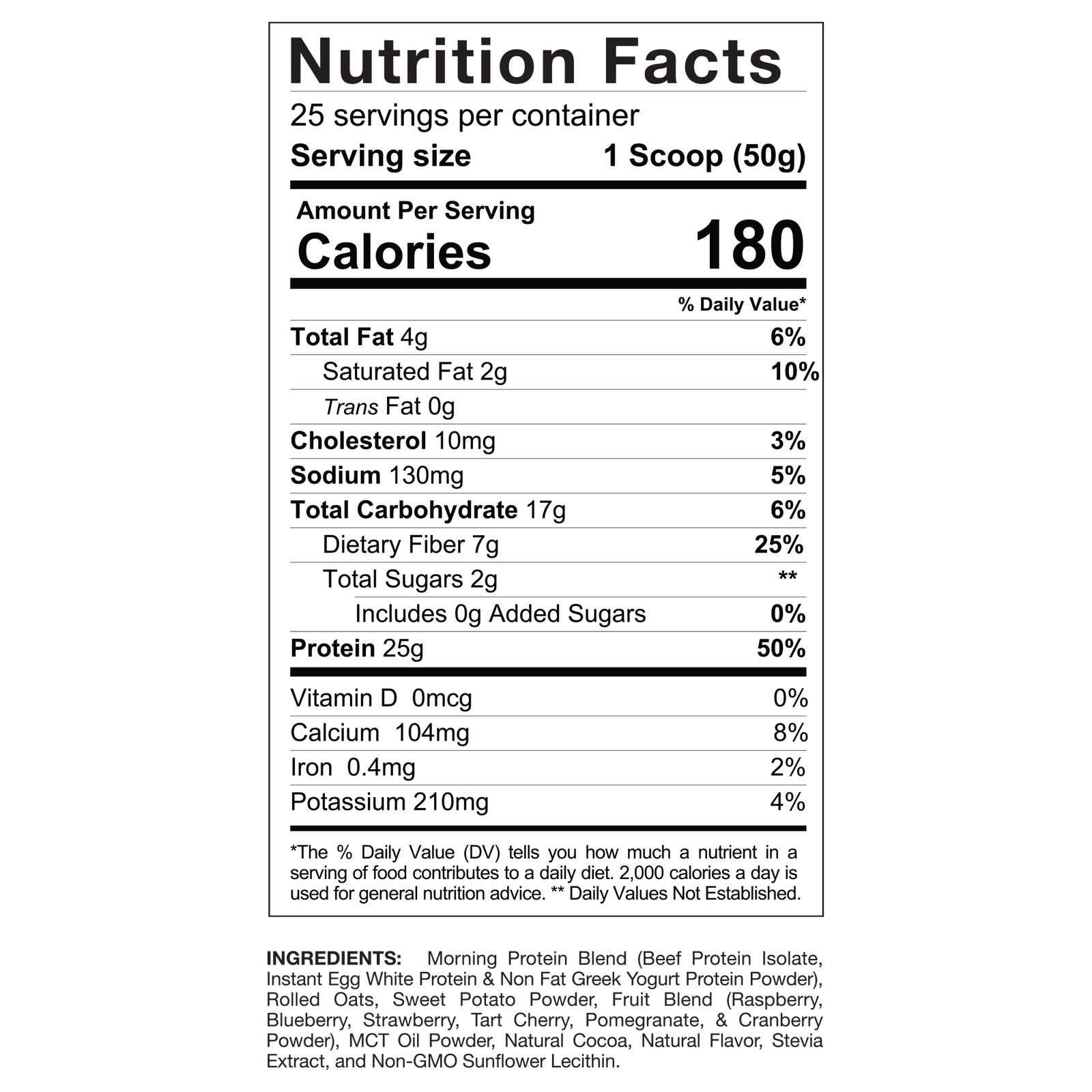 Ingredients: Morning Protein Blend (Beef Protein Isolate, Egg White Protein & Non Fat Greek Yogurt Protein Powder), Chicory Root Fiber, Sweet Potato Powder, Fruit Blend (Raspberry, Strawberry, Blueberry, Tart Cherry, Pomegranate, & Cranberry Juice Concentrates), MCT Oil Powder, Natural Cocoa, Natural Flavor, Stevia Leaf Extract, Sunflower Lecithin.
